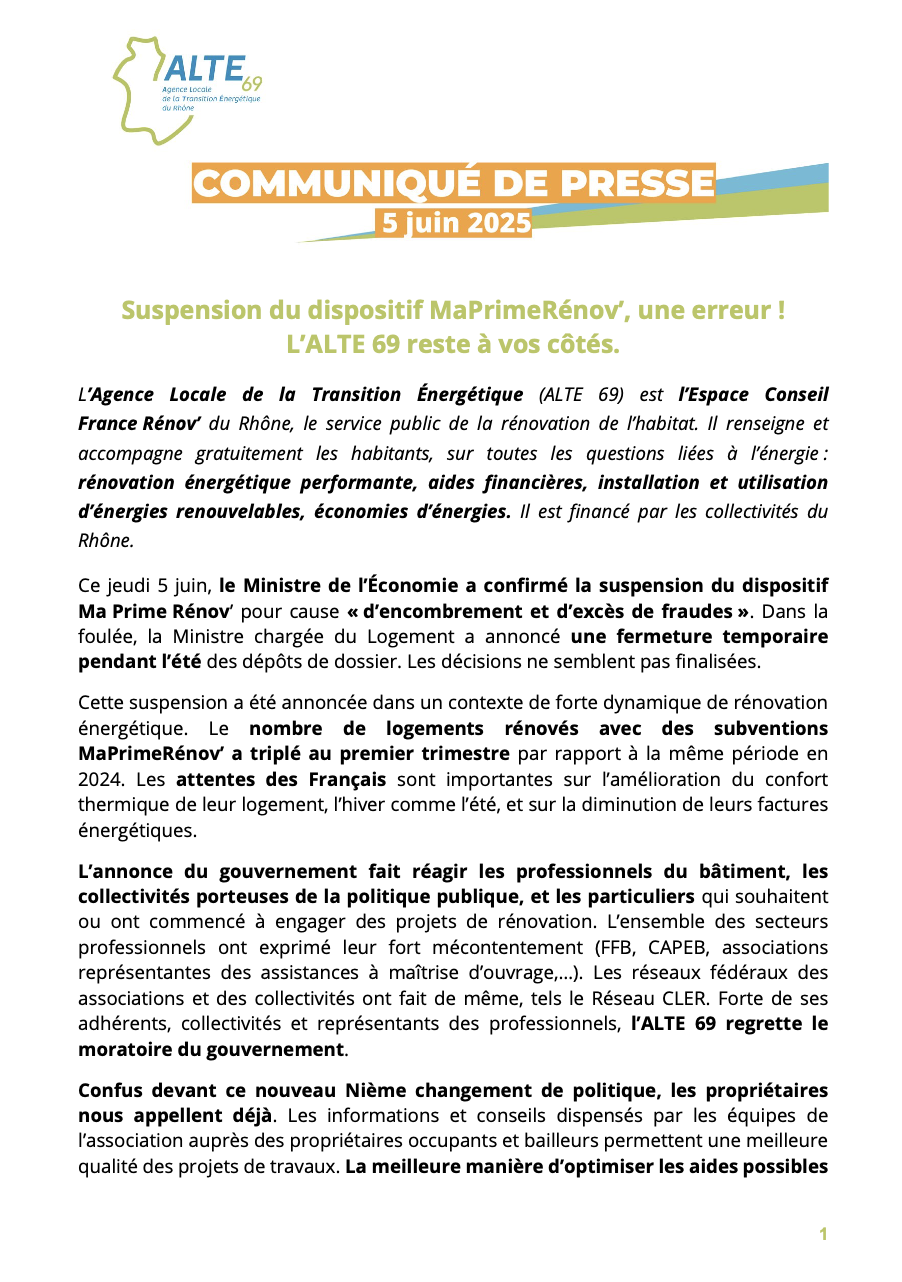 [COMMUNIQUÉ DE PRESSE] Réaction à la suspension du dispositif MaPrimeRénov'