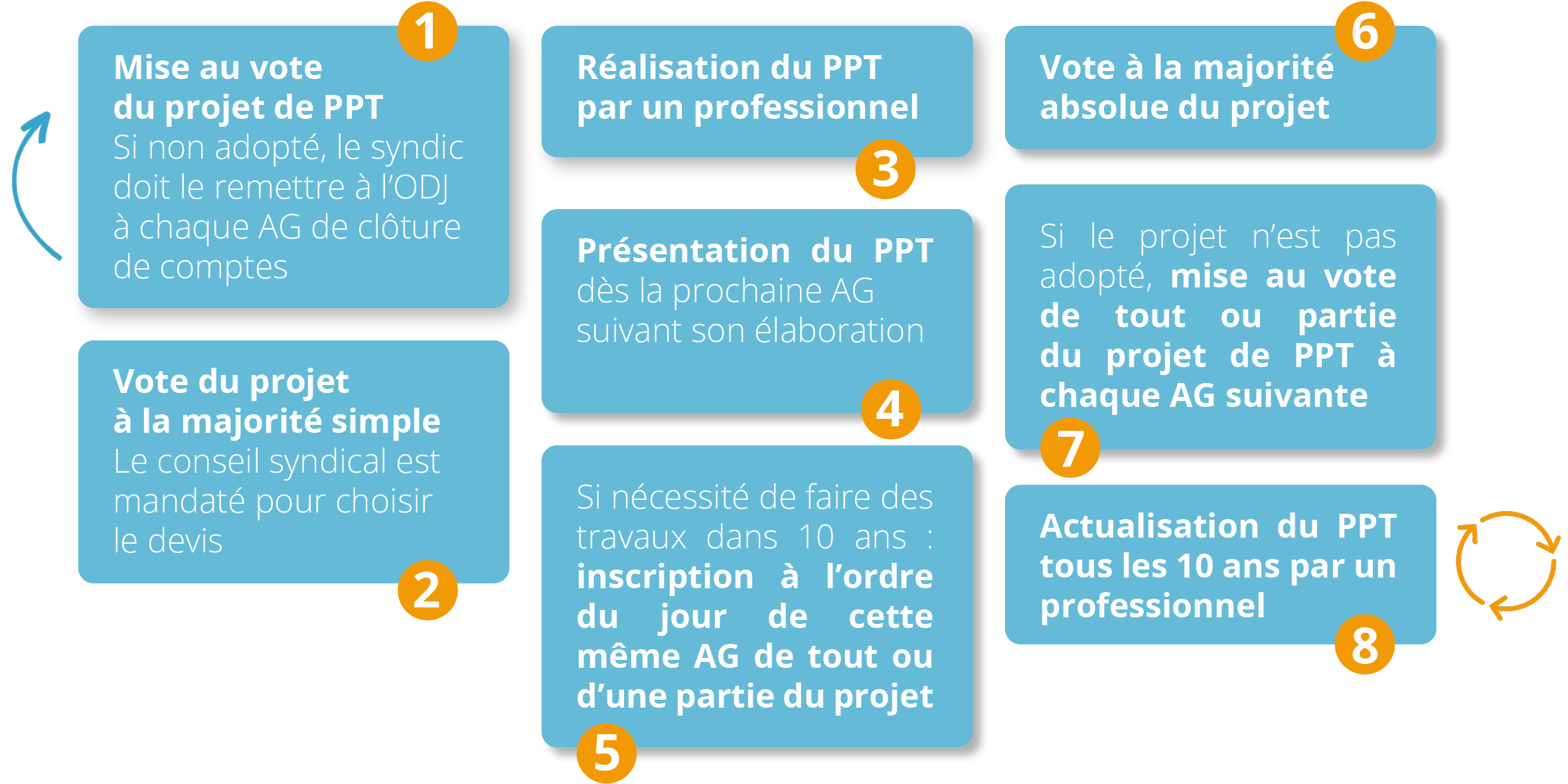 La mise au vote d'un plan pluriannuel de travaux (PPT) par le syndicat de copropriétaires est devenu obligatoire depuis le 1er janvier 2023 pour les copropriétés de plus de 200 lots principaux (logements, bureaux ou commerces) et réceptionnées depuis plus de 15 ans. Ce document permet d’avoir une vision à moyen terme des travaux d’entretien et de rénovation nécessaires à réaliser sur l’immeuble. Dans le cadre d’un PPT, les copropriétaires votent un échéancier de travaux à réaliser dans les dix prochaines années ainsi qu’un fond travaux pour financer en partie ces travaux.