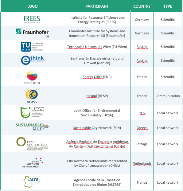 Le projet s'appuie sur les PCAET - Plans Climat-Air-Énergie Territoriaux, anciennement PCET - Plans Climat-Énergie Territoriaux définis par les collectivités. Cinq réseaux existants de collectivités en France, en Italie, en Grèce, au Portugal et aux Pays-Bas participent au projet.