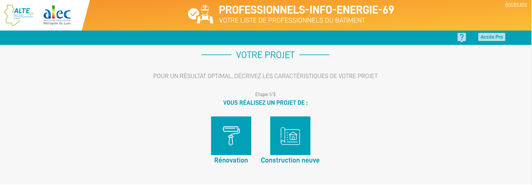 1. Choisissez les caractéristiques de votre projet : Rénovation ou Construction ;