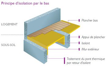 Pour réaliser l’isolation des planchers bas dans le neuf, on interviendra entre la dalle et la chape. En rénovation, l’isolation du sol pourra être réalisée par le dessous (par exemple lors d’un vide sanitaire accessible ou au niveau du plafond de cave) ou par le dessus. Il isolation par le dessus engendre d’importants travaux à évaluer dès le lancement du projet d’isolation.
