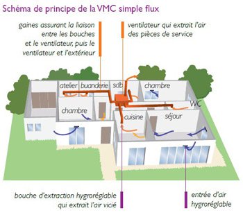 La ventilation mécanique contrôlée simple flux est constituée d’entrée d’air dans les pièces de vie (salon, chambres) et de bouche d’extraction dans les pièces humides (cuisine salle de bain, WC). L’extraction d’air est effectuée par un seul extracteur. Il existe plusieurs types de VMC simple flux :