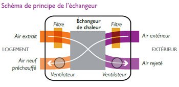 Un système de ventilation double flux avec échangeur permet le renouvellement d’air à haut débit permanent, une répartition homogène de l’air entrant chaud ou froid, une récupération de la chaleur sur l’air sortant, une filtration de l’air entrant.