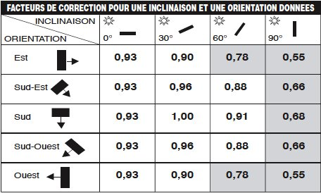 Le tableau ci-dessous donne le facteur de correction à appliquer à la production attendue du système en fonction de son orientation et de son inclinaison.